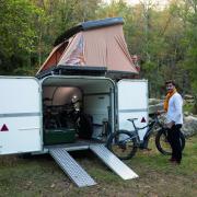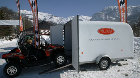 L'OLYMPIUM 360, remorque fourgon tout en polyester pour un grand volume et un faible encombrement. Une solution à la surcharge : transporter quad, moto, matérial en toute facilité.