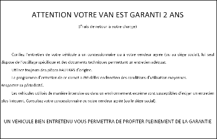 - La garantie : Lire attentivement cette partie, pour bien comprendre vos droits et vos obligations en tant que propriétaire d'un van.