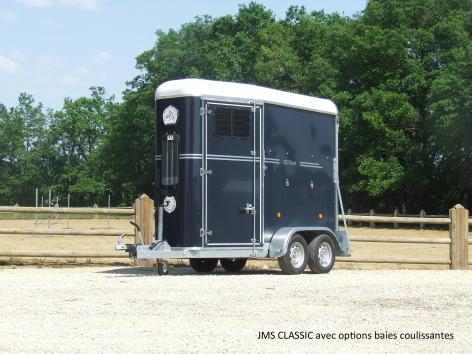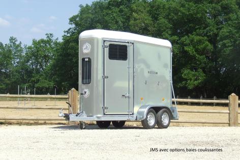 Van 1 place et 1/2, tout polyester, tractable sans permis BE*. Très spacieux, pour un confort optimal, le JMS est aussi bien adapté au transport d'un cheval (quelque soit sa taille) que d'une jument et son poulain.