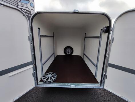 L'OLYMPIUM 260, remorque fourgon tout en polyester pour un grand volume et un faible encombrement. Une solution à la surcharge : transporter quad, moto, matériel en toute facilité.